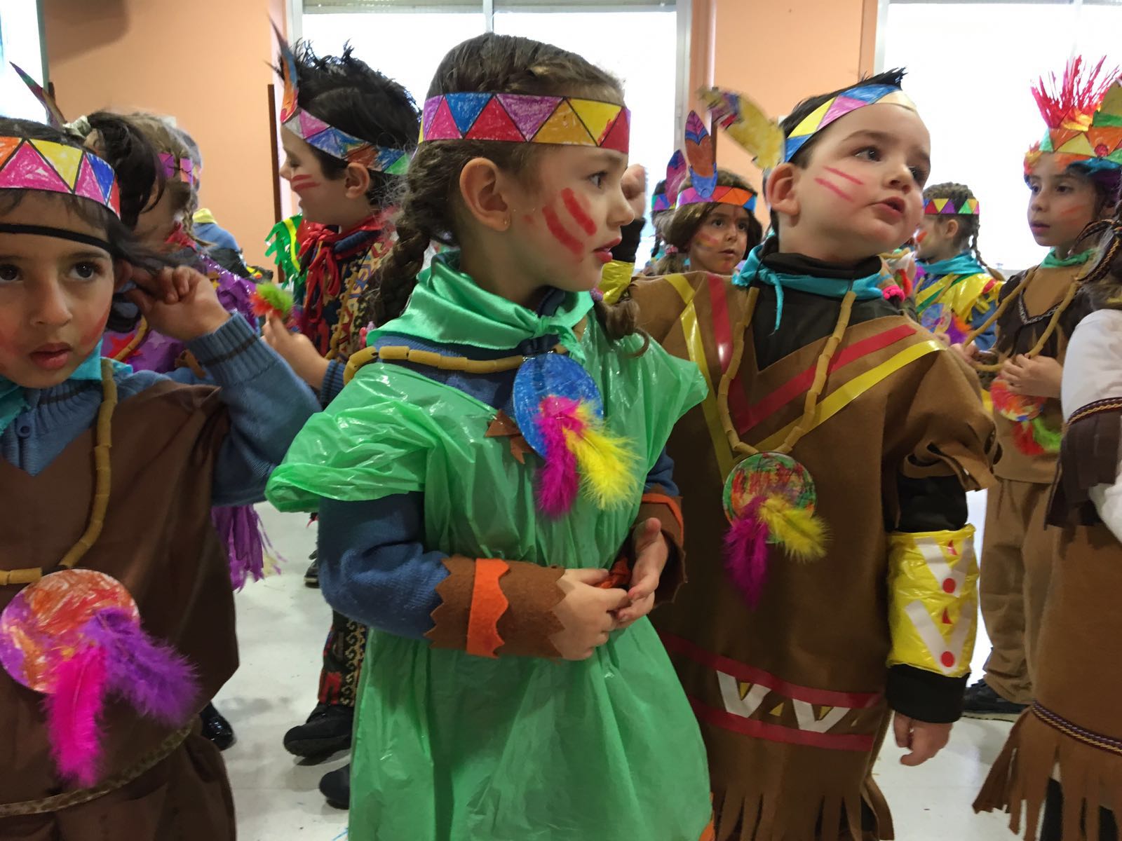 Lo primero que hicimos fue elaborar nuestro collar con macarrones y un adorno con plumas que habíamos hecho en clase anteriormente.