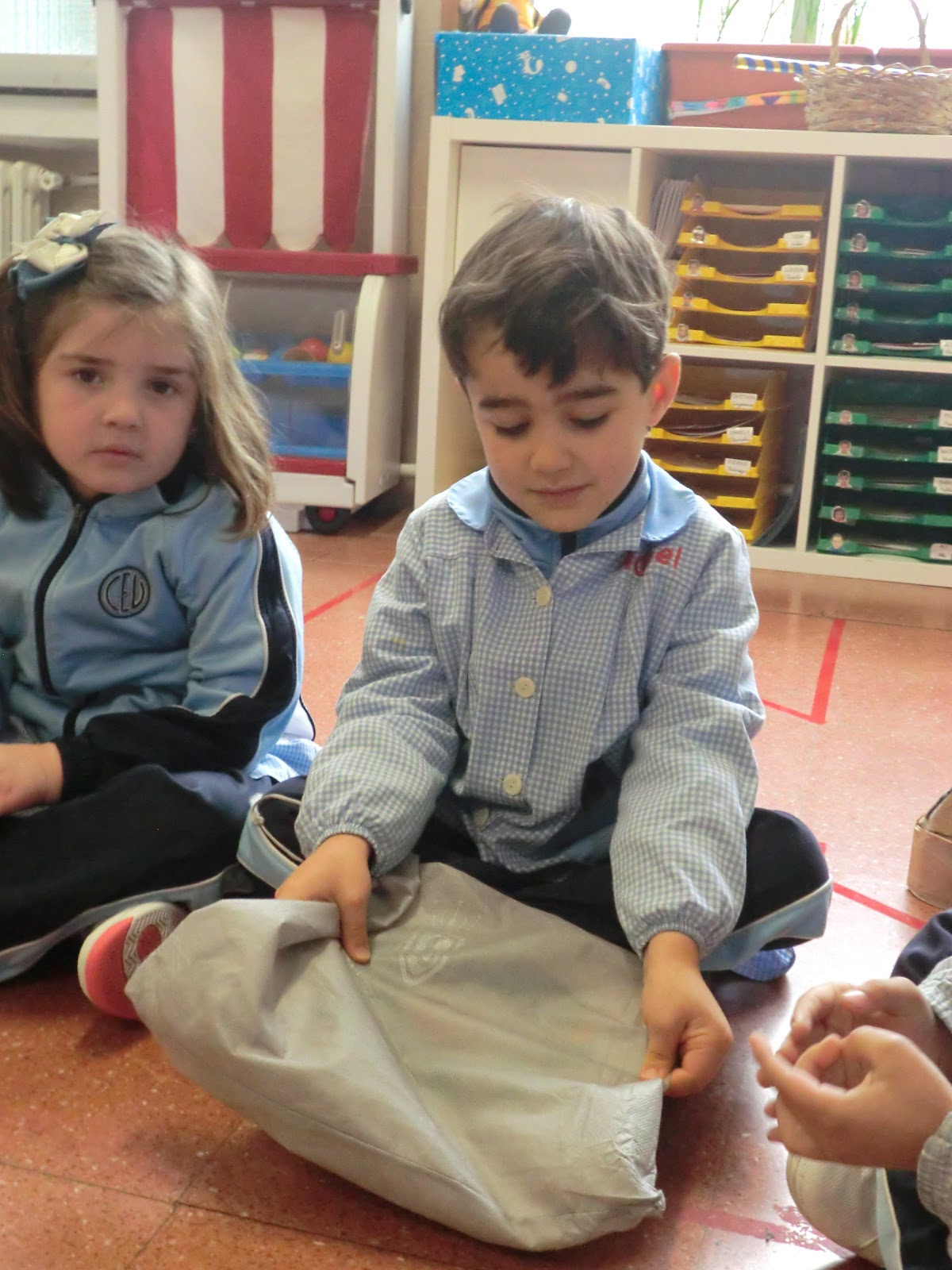 Después de hacer nuestras hipótesis sobre lo que creíamos que había dentro de la bolsa, la abrimos para ver si estábamos en lo cierto, y así fue, tal y como pensábamos había un libro, pero no sabíamos que era un cuento. Nos lo pasamos para tocarlo, ver la textura del papel, olerlo, mirar sus dibujos y leer el título.